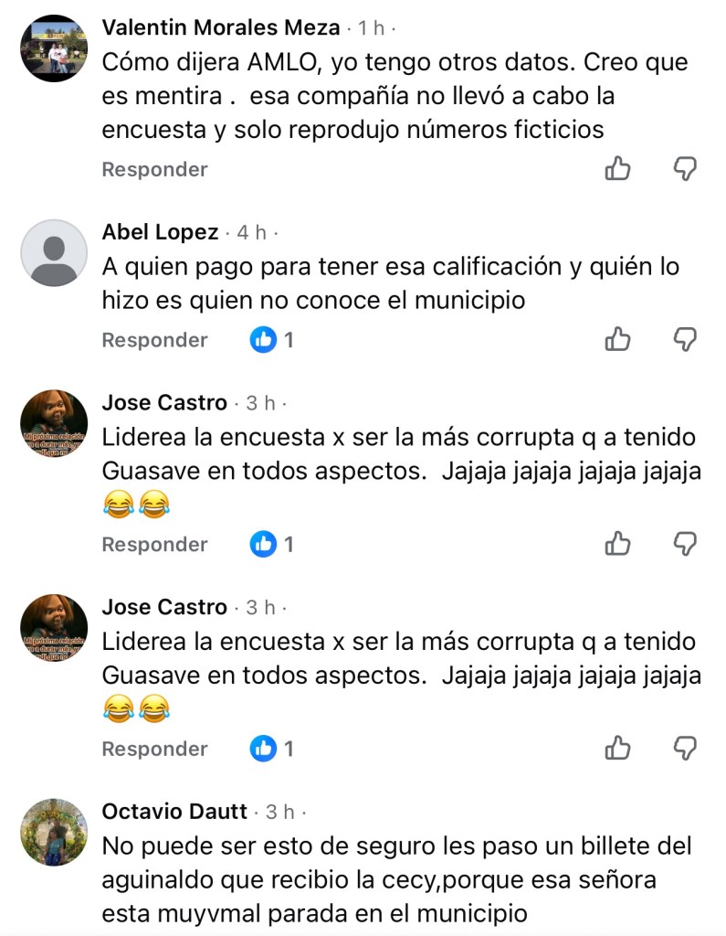 Los comentarios en redes y portales no tardaron en aparecer, y fueron todo menos amables. Que si la encuesta fue “comprada”, que si se “pagó con el crédito de los 60 millones”, que si los encuestados “fueron familiares y miembros del gabinete”. Otros fueron más lapidarios: para algunos guasavenses, el único primer lugar posible para esta administración es en mal gobierno o corrupción.